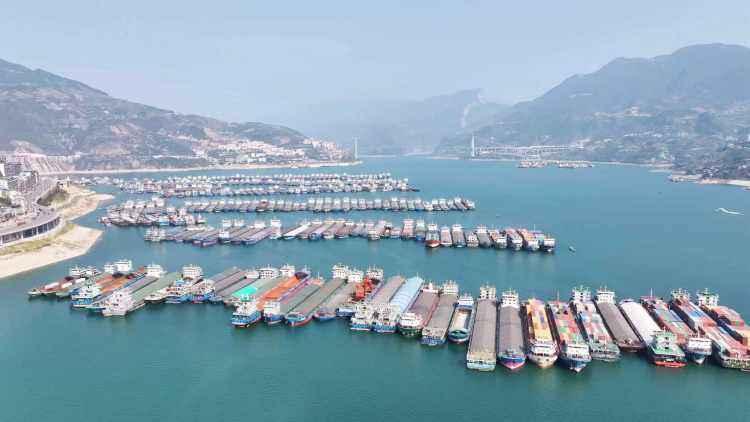 奉节待闸锚地航拍。面对检修期复杂安全形势,重庆海事局优化停泊区范围和容量,建立万州至巫山沿线四区县联动管控机制,依托信息化监管平台实行动态监控,加密水上巡航执法频次,每日跟踪待闸船舶停泊状态,加强跨区域协同分流与危化品船舶专项管控。同时,联动地方政府与企业做好船员服务,实时发布通航信息,解决船员上岸、物资补给、污染物接收等实际需求。检修期间,重庆海事保障了2万艘次船舶和近20万船员安全稳定。