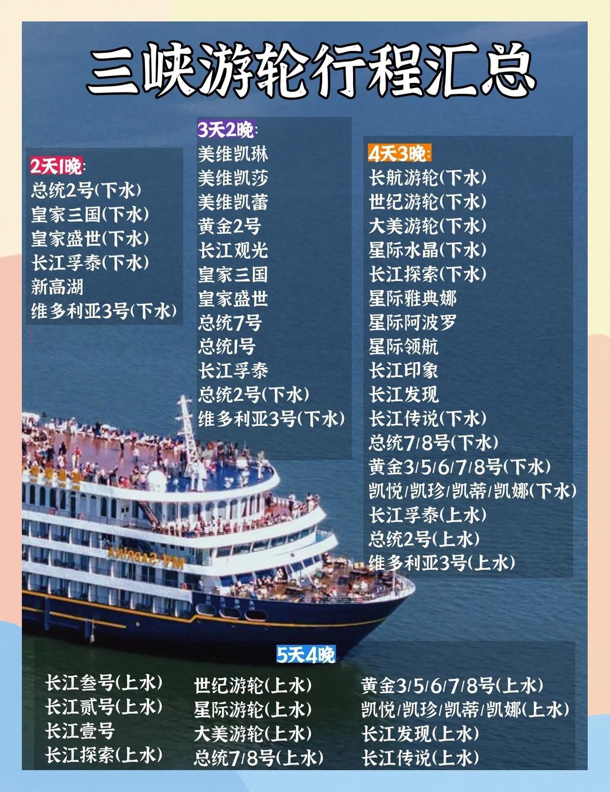![]() ![]() ![]() ![]() ![]() ![]() ![]() 总统2号(下水) 皇家三国(下水) 皇家盛世(下水) 长江孚泰(下水) 新高湖 维多利亚3号(下水) 3天2晚的游轮: 美维凯琳、凯莎、凯蕾 黄金2号 长江观光 皇家三国、盛世 总统7号 长江孚泰 总统1号 总统2号(下水) 维多利亚3号(下水) 价格参考: 💸 >5500元:长江探索 💸 4000-5000元:长江壹号、长江叁号、世纪绿洲、凯歌、荣耀 💸 3000-4000元:长江贰号、世纪神话、华夏神女3号、美维凯悦 💸 2000-3000元:星际游轮、黄金游轮、总统7/8号、美维凯蒂、凯娜、凯珍、华夏神女2/1号、长江发现、长江传说、皇家星光 💸 1500-2000元:美维凯莎、凯琳、凯蕾、总统1号、总统2号、维多利亚3号 💸 1000元左右:长江孚泰、长江观光、皇家三国、盛世、新高湖 希望这些信息能帮到你,祝你旅途愉快!如果有更多问题,欢迎留言哦! |
