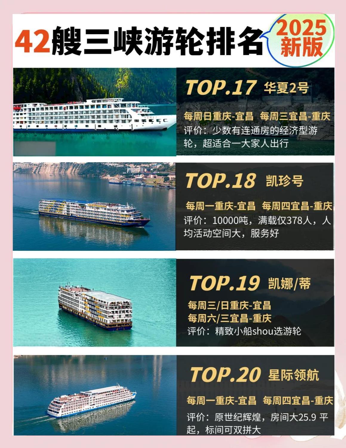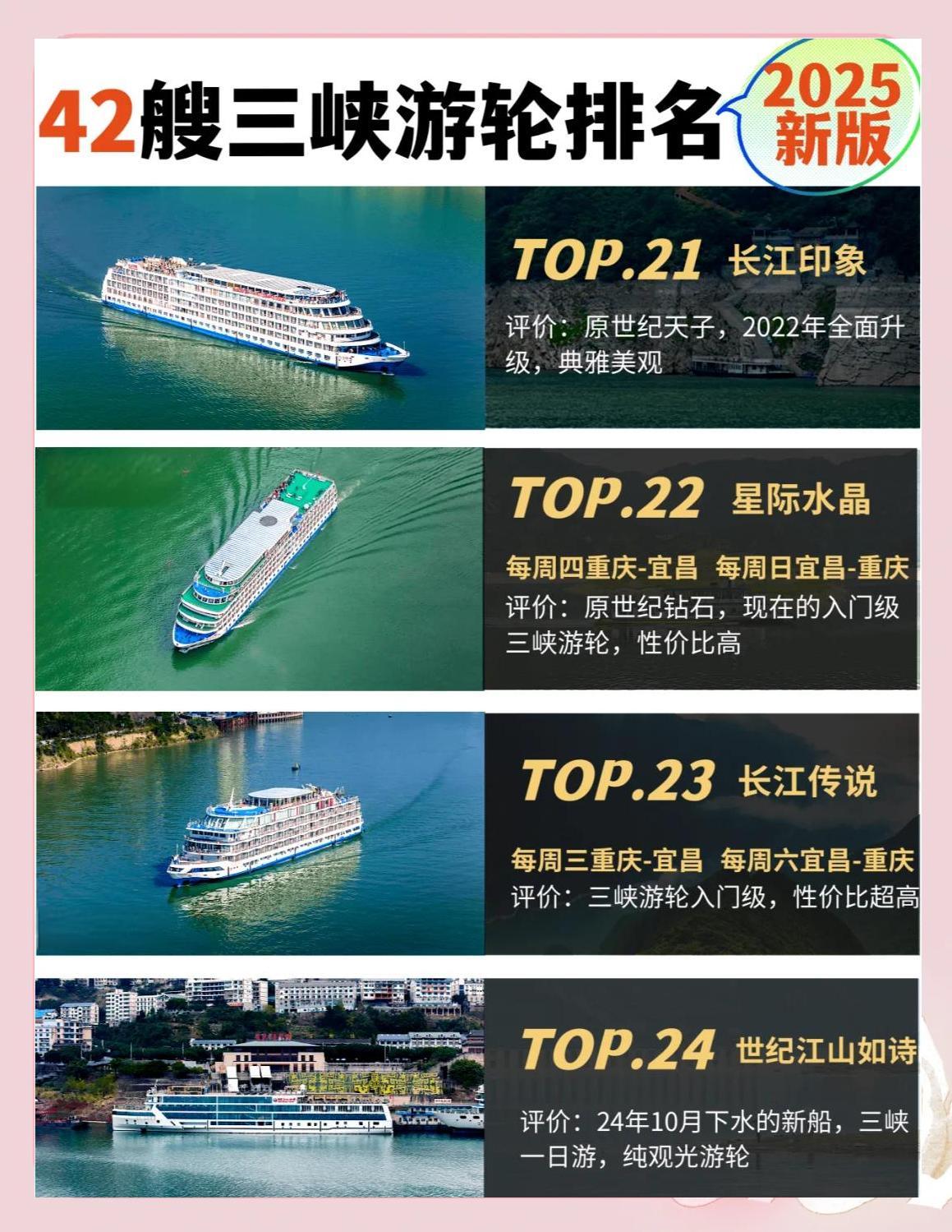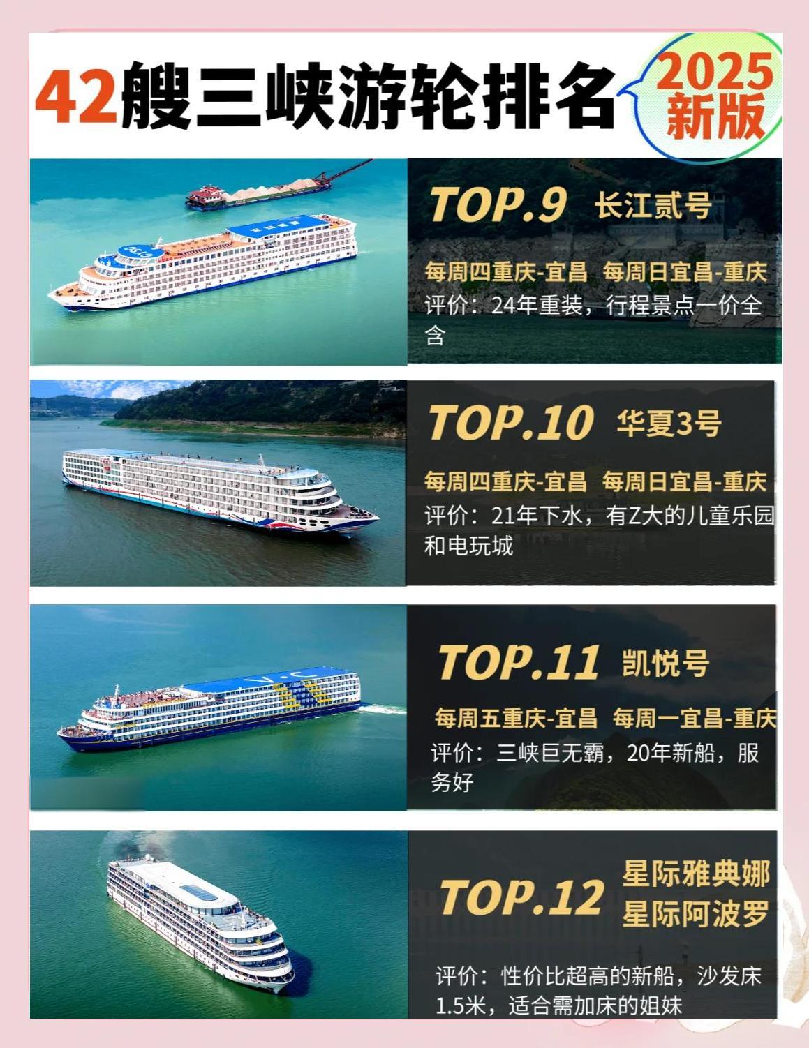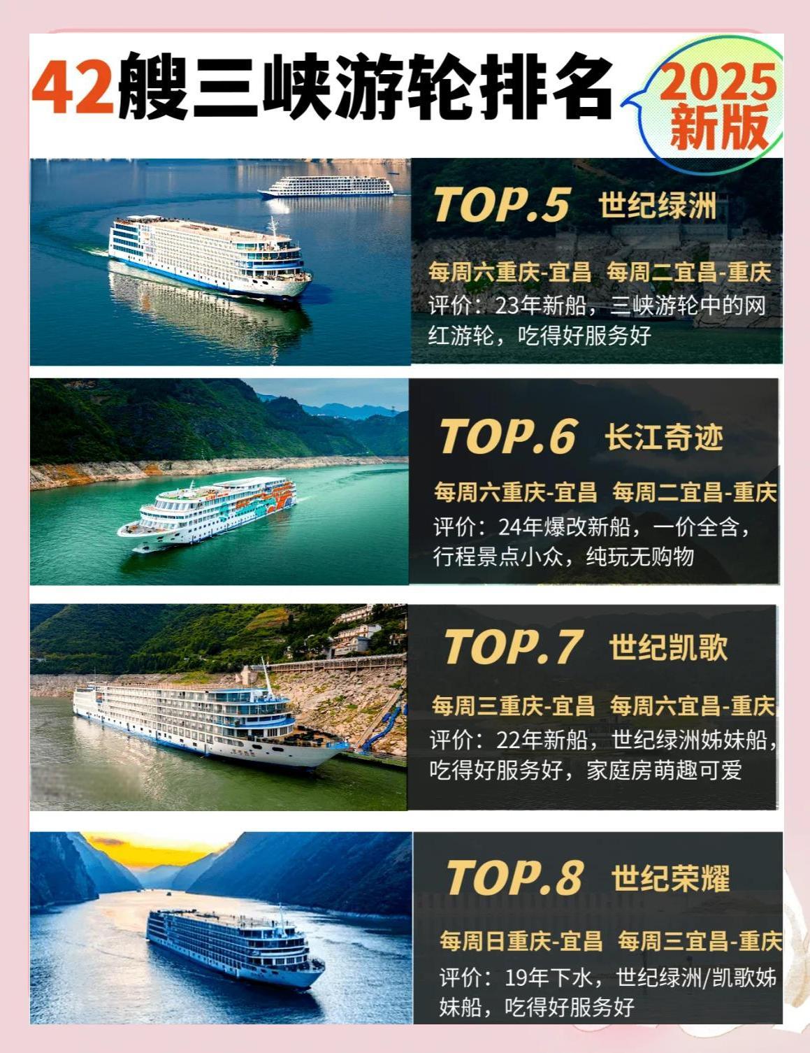 2025年,三峡游轮将迎来一波更新换代,四五艘老船将退役,同时将有两艘全新游轮加入。那么,哪艘船将成为新的“船王”呢?以下是2025年三峡游轮的最新排名:![]() ![]() ![]() ![]() ![]() ![]() ![]() ![]() ![]() 每周四重庆-宜昌,每周日宜昌-重庆 评价:新船换代,五一节首航,堪称三峡游轮的“天花板”。 🥈 长江壹号 评价:一价全含,行程丰富,唯一可以体验升船机的游轮。 🥉 长江叁号 每周五重庆-宜昌,每周一宜昌-重庆 评价:造价最高、设施最好的游轮,今年餐饮升级,服务一流。 🏅 世纪远航 每周五重庆-宜昌,每周一宜昌-重庆 评价:餐饮和服务都非常好,酒水畅饮,24年9月下水的新船。 🏆 世纪绿洲 每周六重庆-宜昌,每周二宜昌-重庆 评价:23年新船,网红游轮,餐饮和服务都非常好。 🎉 长江奇迹 每周六重庆-宜昌,每周二宜昌-重庆 评价:24年全新改造,行程景点小众,纯玩无购物。 🎈 世纪凯歌 每周三重庆-宜昌,每周六宜昌-重庆 评价:22年新船,世纪绿洲的姊妹船,餐饮和服务都非常好。 🎁 世纪荣耀 每周日重庆-宜昌,每周三宜昌-重庆 评价:19年下水,世纪绿洲/凯歌的姊妹船,餐饮和服务都非常好。 🎈 长江贰号 每周四重庆-宜昌,每周日宜昌-重庆 评价:24年重装,行程景点一价全含。 🎈 华夏3号 每周四重庆-宜昌,每周日宜昌-重庆 评价:21年下水,拥有最大的儿童乐园和电玩城。 🎈 凯悦号 每周五重庆-宜昌,每周一宜昌-重庆 评价:三峡巨无霸,20年新船,服务一流。 🎈 星际雅典娜/星际阿波罗 评价:性价比超高的新船,适合需加床的游客。 |