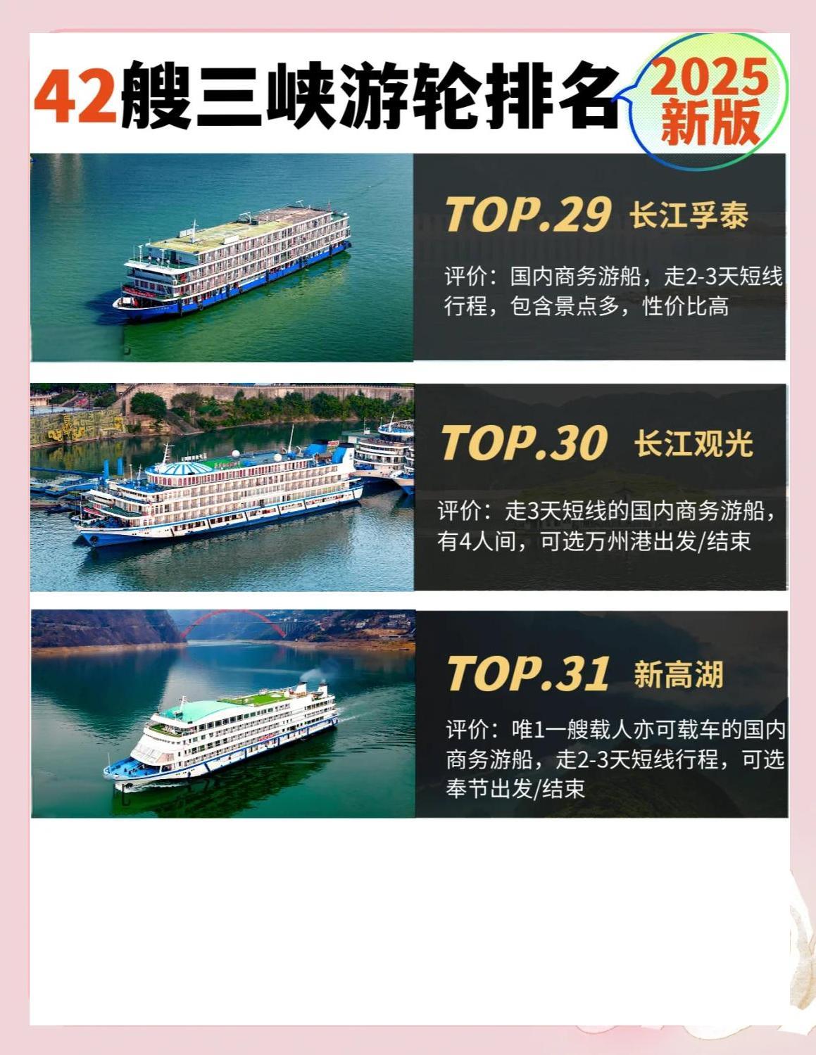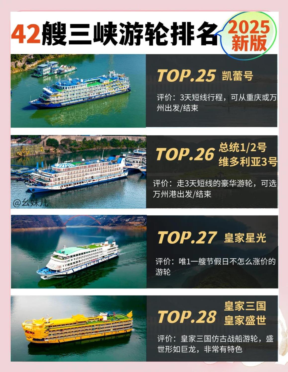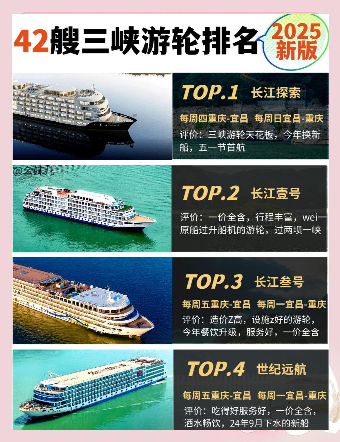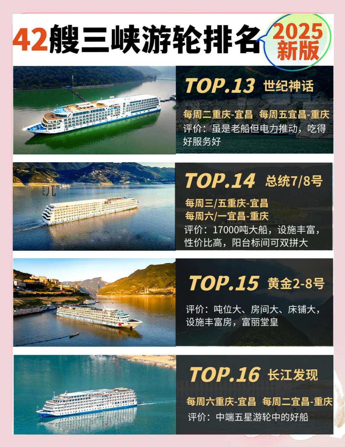 2025年,三峡游轮将迎来一波更新换代,四五艘老船将退役,同时将有两艘全新游轮加入。那么,哪艘船将成为新的“船王”呢?以下是2025年三峡游轮的最新排名:![]() ![]() ![]() ![]() ![]() ![]() ![]() ![]() ![]() 每周四重庆-宜昌,每周日宜昌-重庆 评价:新船换代,五一节首航,堪称三峡游轮的“天花板”。 🥈 长江壹号 评价:一价全含,行程丰富,唯一可以体验升船机的游轮。 🥉 长江叁号 每周五重庆-宜昌,每周一宜昌-重庆 评价:造价最高、设施最好的游轮,今年餐饮升级,服务一流。 🏅 世纪远航 每周五重庆-宜昌,每周一宜昌-重庆 评价:餐饮和服务都非常好,酒水畅饮,24年9月下水的新船。 🏆 世纪绿洲 每周六重庆-宜昌,每周二宜昌-重庆 评价:23年新船,网红游轮,餐饮和服务都非常好。 🎉 长江奇迹 每周六重庆-宜昌,每周二宜昌-重庆 评价:24年全新改造,行程景点小众,纯玩无购物。 🎈 世纪凯歌 每周三重庆-宜昌,每周六宜昌-重庆 评价:22年新船,世纪绿洲的姊妹船,餐饮和服务都非常好。 🎁 世纪荣耀 每周日重庆-宜昌,每周三宜昌-重庆 评价:19年下水,世纪绿洲/凯歌的姊妹船,餐饮和服务都非常好。 🎈 长江贰号 每周四重庆-宜昌,每周日宜昌-重庆 评价:24年重装,行程景点一价全含。 🎈 华夏3号 每周四重庆-宜昌,每周日宜昌-重庆 评价:21年下水,拥有最大的儿童乐园和电玩城。 🎈 凯悦号 每周五重庆-宜昌,每周一宜昌-重庆 评价:三峡巨无霸,20年新船,服务一流。 🎈 星际雅典娜/星际阿波罗 评价:性价比超高的新船,适合需加床的游客。 |