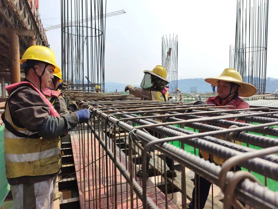 当天,记者在现场看到,工人们正在拆除浇筑t梁的模具,预制t梁已经全部浇筑完毕,即将进行t梁安装。二级平台上,工人们正在绑扎中间层横纵撑的钢筋为浇筑作准备。