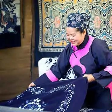 土家蜡染常用吉祥图案为底进行造型,多用于门帘、桌布、帐沿等生活用品,注重配色纯净,讲究立意构图,艺术风格奇特。制作时将白布平铺,将蜡加温溶解为蜡液,再用蜡刀蘸取蜡液,在白布上描绘图案,绘成后,将布放进染缸浸染,染好捞出用清水煮沸,等蜡溶化后即呈现出白色的花纹。