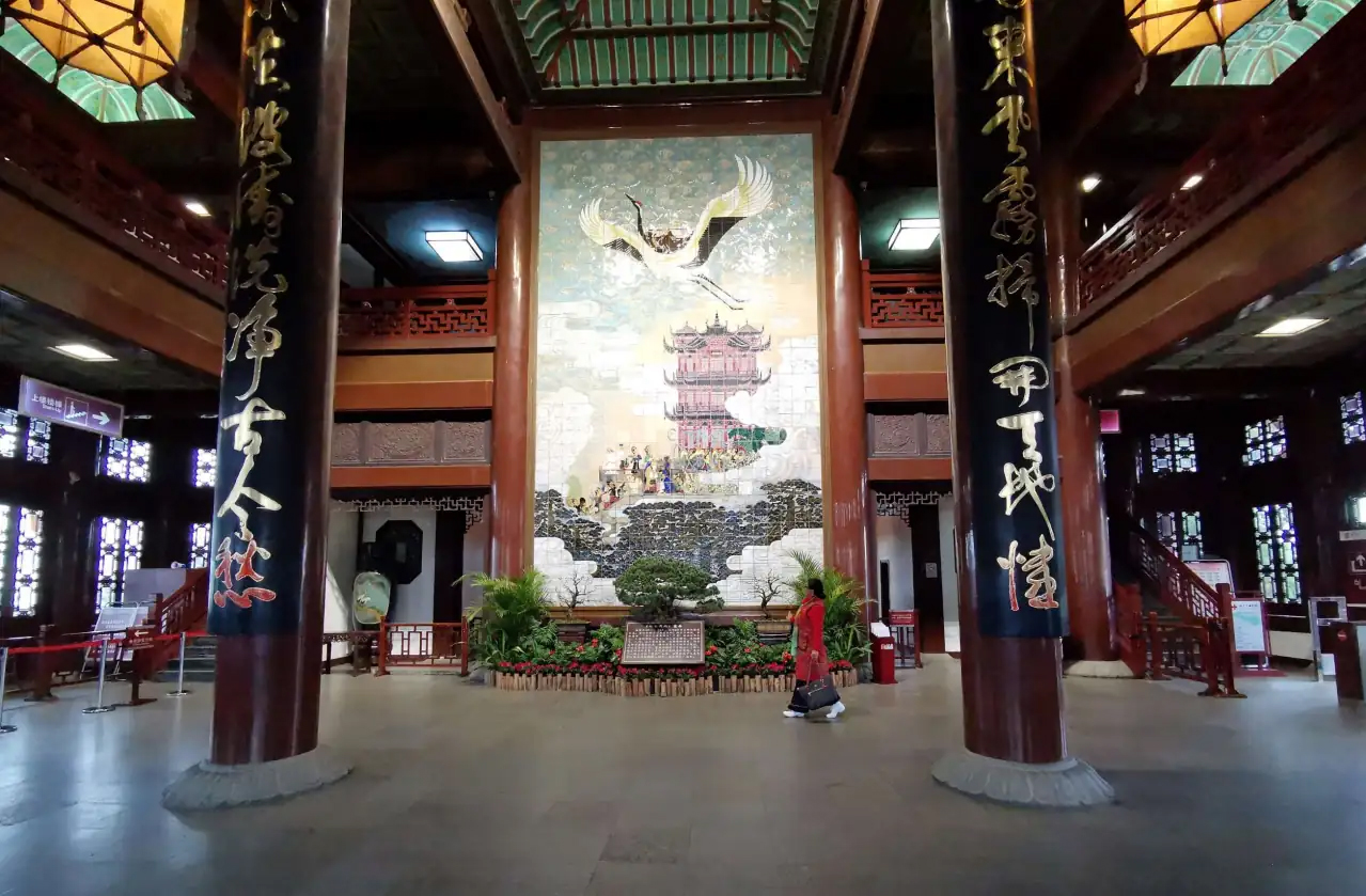 二楼大厅正面墙上有用大理石镌刻的唐代阎伯理撰写的《黄鹤楼记》,记述了黄鹤楼兴废沿革和名人轶事;楼记两侧为两幅壁画,一幅是“孙权筑城”,形象地说明黄鹤楼和武昌城相继诞生的历史;另一幅是“周瑜设宴”,反映三国名人去黄鹤楼的活动。 [26] ![]() 三楼