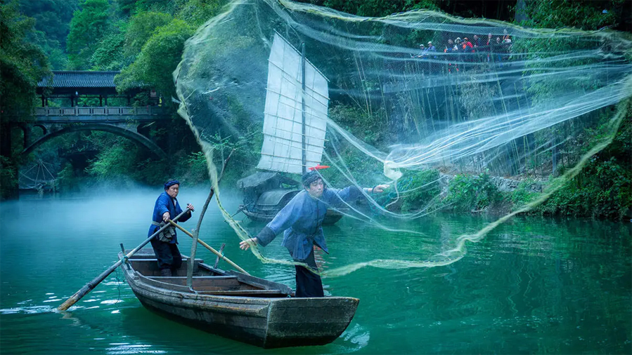 ![]() 三峡人家人文景点包括水上人家、溪边人家、山上人家,囊括传统的峡江吊脚楼峡江古建筑,清溪之中的古帆船、乌篷船等仿古景观以及渔家在江面上撒网打鱼、溪边少女古法棒槌清洗衣服等习俗风情表演。