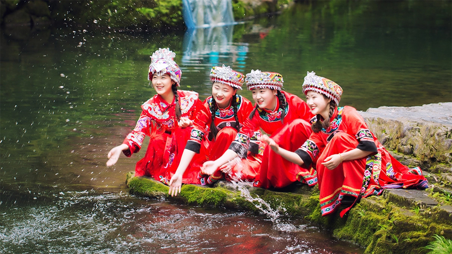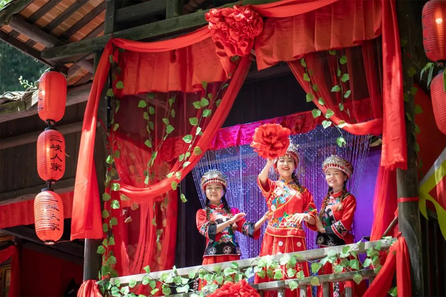 溪边人家依山傍水,一半着陆,一半入水。吊脚楼建筑景观,主要表演为山里妹子捶洗衣服、唱情歌的场景。