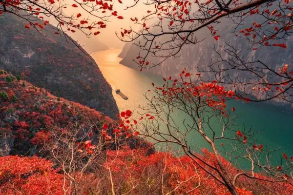![]() ![]() 透过红叶远眺瞿塘峡游船。(王传贵摄)