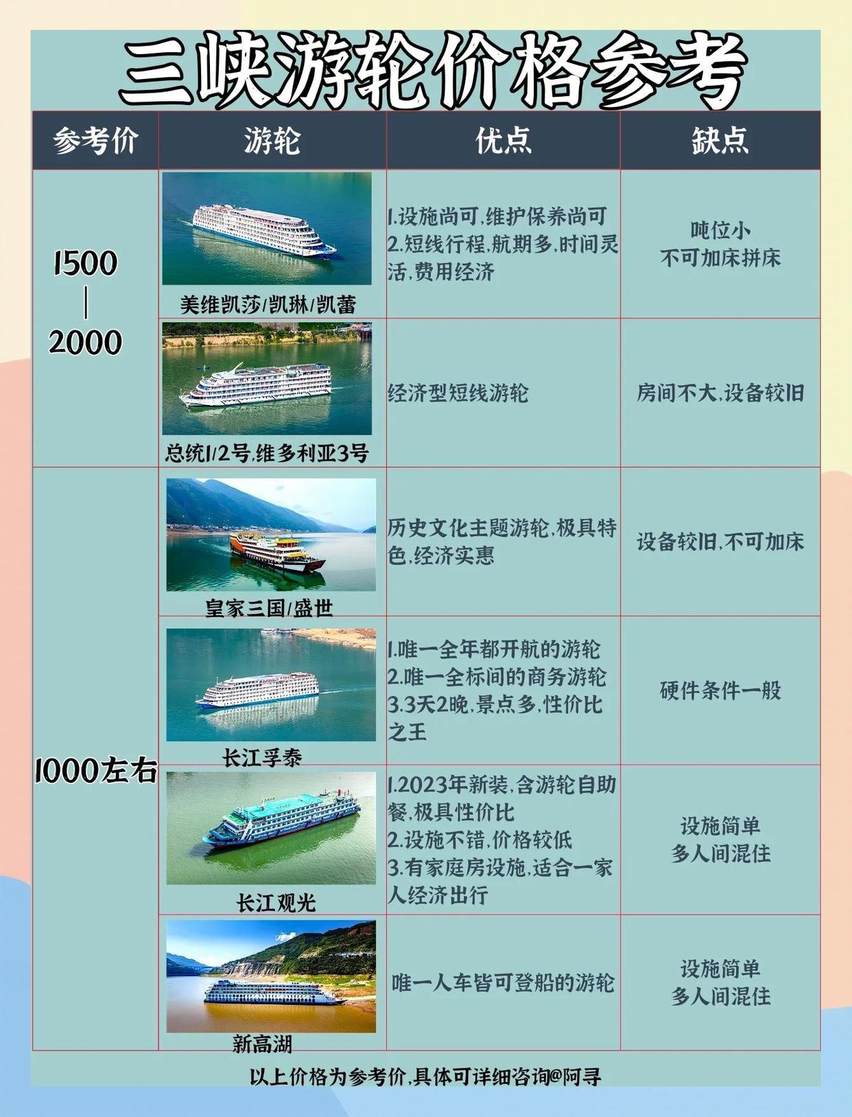 ![]() ![]() ![]() ![]() ![]() ![]() ![]() 总统2号(下水) 皇家三国(下水) 皇家盛世(下水) 长江孚泰(下水) 新高湖 维多利亚3号(下水) 3天2晚的游轮: 美维凯琳、凯莎、凯蕾 黄金2号 长江观光 皇家三国、盛世 总统7号 长江孚泰 总统1号 总统2号(下水) 维多利亚3号(下水) 价格参考: 💸 >5500元:长江探索 💸 4000-5000元:长江壹号、长江叁号、世纪绿洲、凯歌、荣耀 💸 3000-4000元:长江贰号、世纪神话、华夏神女3号、美维凯悦 💸 2000-3000元:星际游轮、黄金游轮、总统7/8号、美维凯蒂、凯娜、凯珍、华夏神女2/1号、长江发现、长江传说、皇家星光 💸 1500-2000元:美维凯莎、凯琳、凯蕾、总统1号、总统2号、维多利亚3号 💸 1000元左右:长江孚泰、长江观光、皇家三国、盛世、新高湖 希望这些信息能帮到你,祝你旅途愉快!如果有更多问题,欢迎留言哦! |
