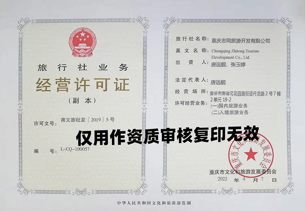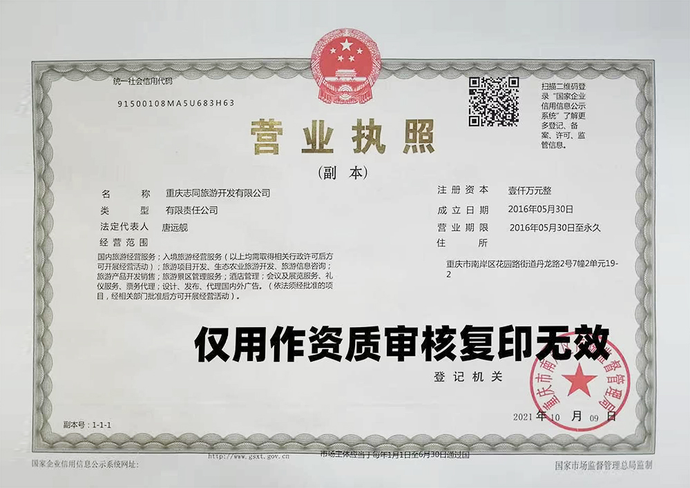 重庆志同旅游开发有限公司于2016年05月30日成立。法定代表人唐远舰,公司经营范围包括:国内旅游经营服务;入境旅游经营服务(以上均需取得相关行政许可后方可开展经营活动);旅游项目开发、生态农业旅游开发、旅游信息咨询;旅游产品开发销售;旅游景区管理服务;酒店管理;会议及展览服务、礼仪服务、票务代理;设计、发布、代理国内外广告等。