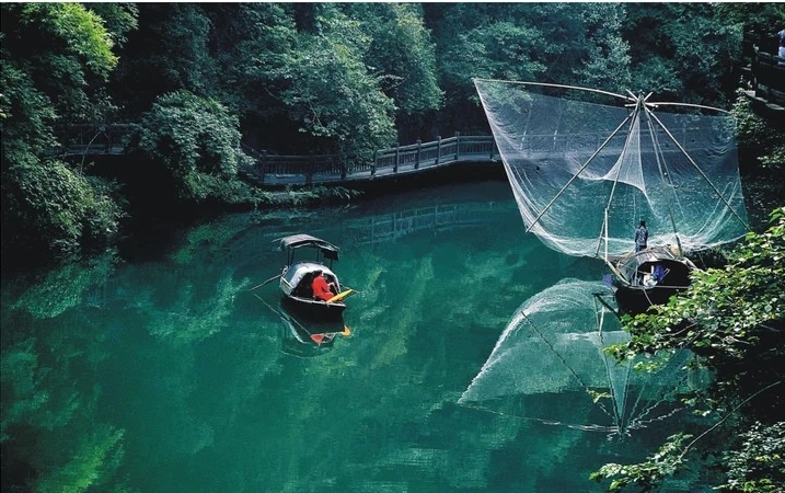 峡江渔船,风情独具,它既是水上渔民的“家”,又是古老三峡一道独特的风景线,历数千年而不衰,有如活跃在峡江一带的黑精灵。峡江渔船形如绍兴扳罾 沿着清幽的溪谷前行,竹林掩映,山歌互答,不知不觉,就会产生一种“步人桃源不知归”的诗意。眼前的渔具叫扳罾,是峡江人智慧的结晶。过去的峡江滩多水险,暗礁密布,在江上把这张大网撒下去是一件非常困难的事。聪明的峡江人就利用杠杆原理把网的4个角收起来,一拉一收,非常轻松就把渔网收起来了。摇橹荡舟间,渔船就轻轻地拐了个弯,穿过了古朴的石拱桥。